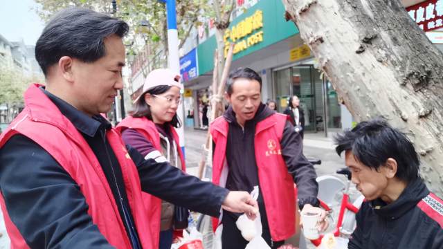 一女流浪者坐在金碧路邊乞討,志愿者走上前給她送上包子、油餅,楊蕾從保溫桶倒了一杯熱八寶粥,女流浪者接過八寶粥趕緊喝了起來,一邊喝一邊說,“午飯還沒吃上,這下不餓肚子了!”