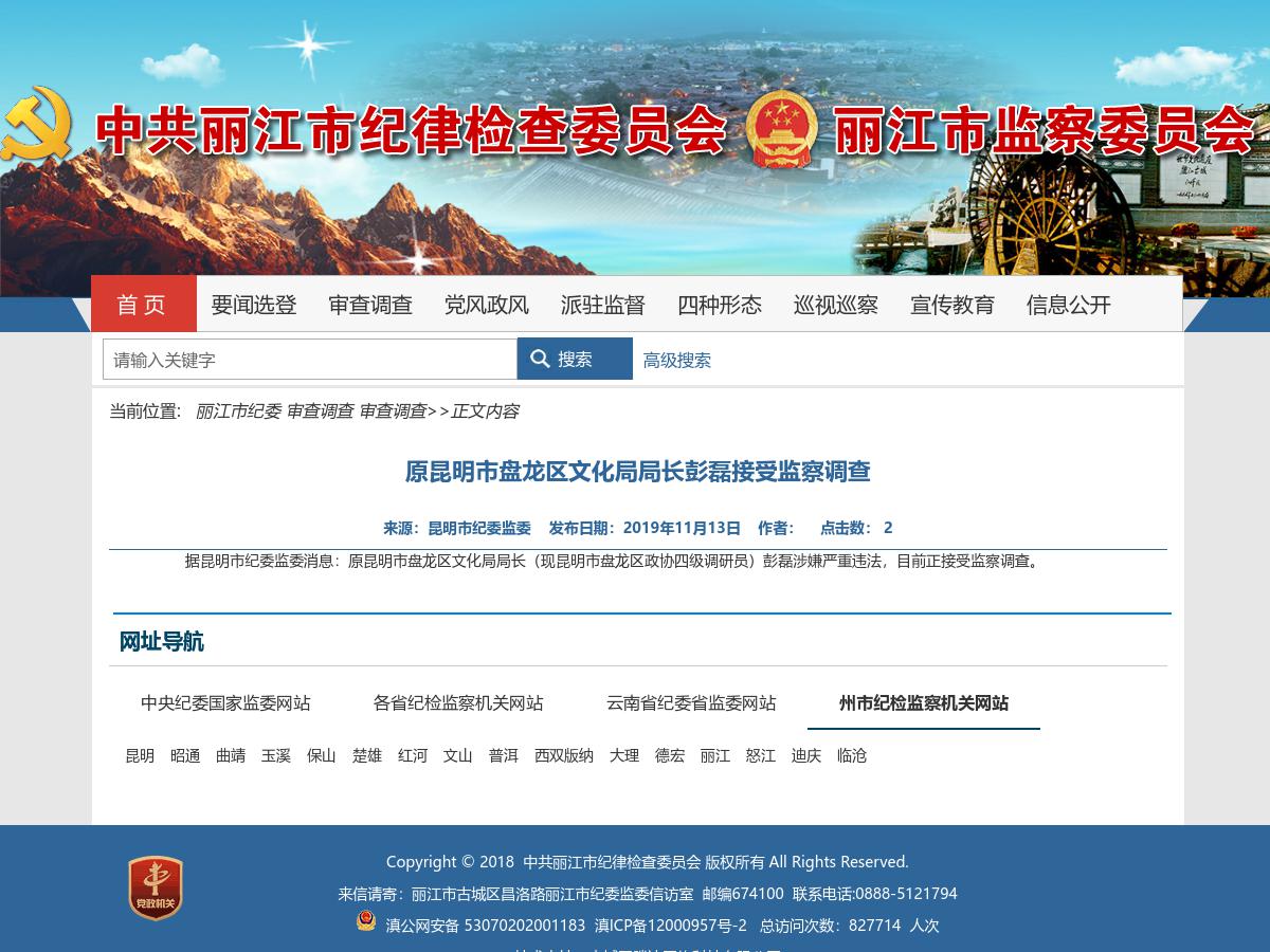 據(jù)昆明市紀(jì)委監(jiān)委消息:原昆明市盤龍區(qū)文化局局長(zhǎng)(現(xiàn)昆明市盤龍區(qū)政協(xié)四級(jí)調(diào)研員)彭磊涉嫌嚴(yán)重違法,目前正接受監(jiān)察調(diào)查。(本文由昆明信息港寫(xiě)稿機(jī)器人小明根據(jù)麗江市紀(jì)委網(wǎng)站數(shù)據(jù)自動(dòng)合成發(fā)布)
