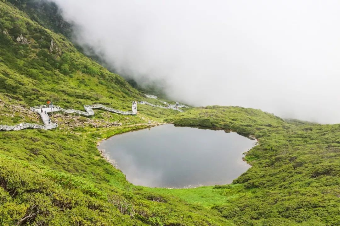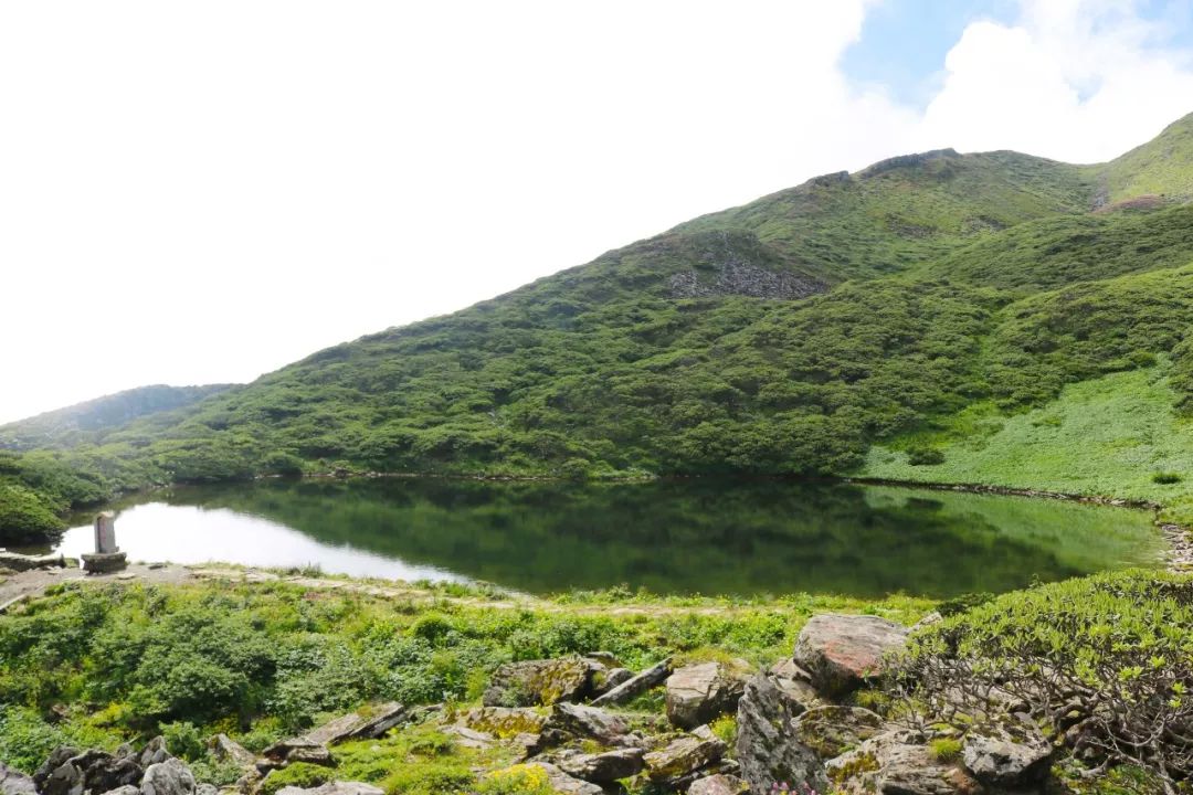 沿著棧道不斷向山頂攀登,看著含苞欲放的高山杜鵑,清澈的溪水,蒼翠欲滴的草地,草地上零星點(diǎn)點(diǎn)的野花,我對(duì)洗馬潭的期待愈發(fā)強(qiáng)烈,轉(zhuǎn)過(guò)一個(gè)彎,一潭清澈的池水出現(xiàn)在我面前,走進(jìn)一看“洗馬潭”三個(gè)字讓我知道,這就是大名鼎鼎的洗馬潭。