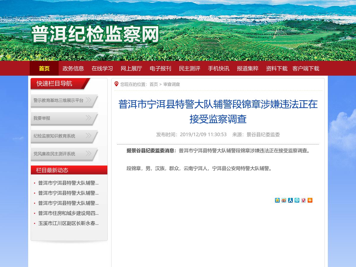 據(jù)景谷縣紀(jì)委監(jiān)委消息:普洱市寧洱縣特警大隊(duì)輔警段錦章涉嫌違法正在接受監(jiān)察調(diào)查。