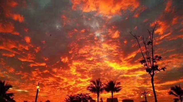 突然,天邊噴出一道燦爛無(wú)比的霞光,剎那間,天空都被染成了深紅色,就像是一片波瀾壯闊的紅色海洋,顏色更為金黃的像是一只“鳳凰”,像是在“紅?!崩锺Y騁翱翔,十分壯觀,真是“此景只應(yīng)天上有,人間能得幾回觀”。此時(shí),天空越來(lái)越紅了,紅得幾乎滴血,就像是一朵碩大的紅牡丹在天邊怒放,盡情的噴芳吐艷。匆忙的車(chē)流和行人紛紛駐足停留,用相機(jī)記錄下這神圣的一刻。
