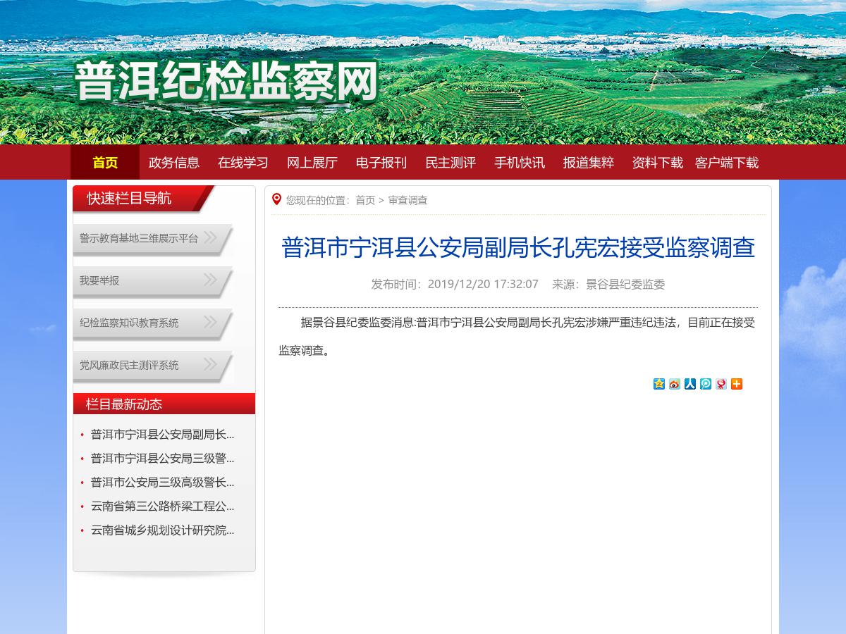 據(jù)景谷縣紀(jì)委監(jiān)委消息:普洱市寧洱縣公安局副局長孔憲宏涉嫌嚴(yán)重違紀(jì)違法,目前正在接受監(jiān)察調(diào)查。(本文由昆明信息港寫稿機(jī)器人小明根據(jù)普洱紀(jì)委網(wǎng)站數(shù)據(jù)自動合成發(fā)布)