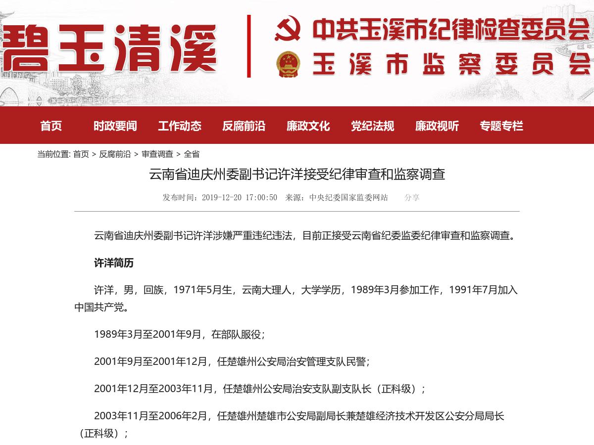云南省迪慶州委副書記許洋涉嫌嚴重違紀違法,目前正接受云南省紀委監(jiān)委紀律審查和監(jiān)察調(diào)查。