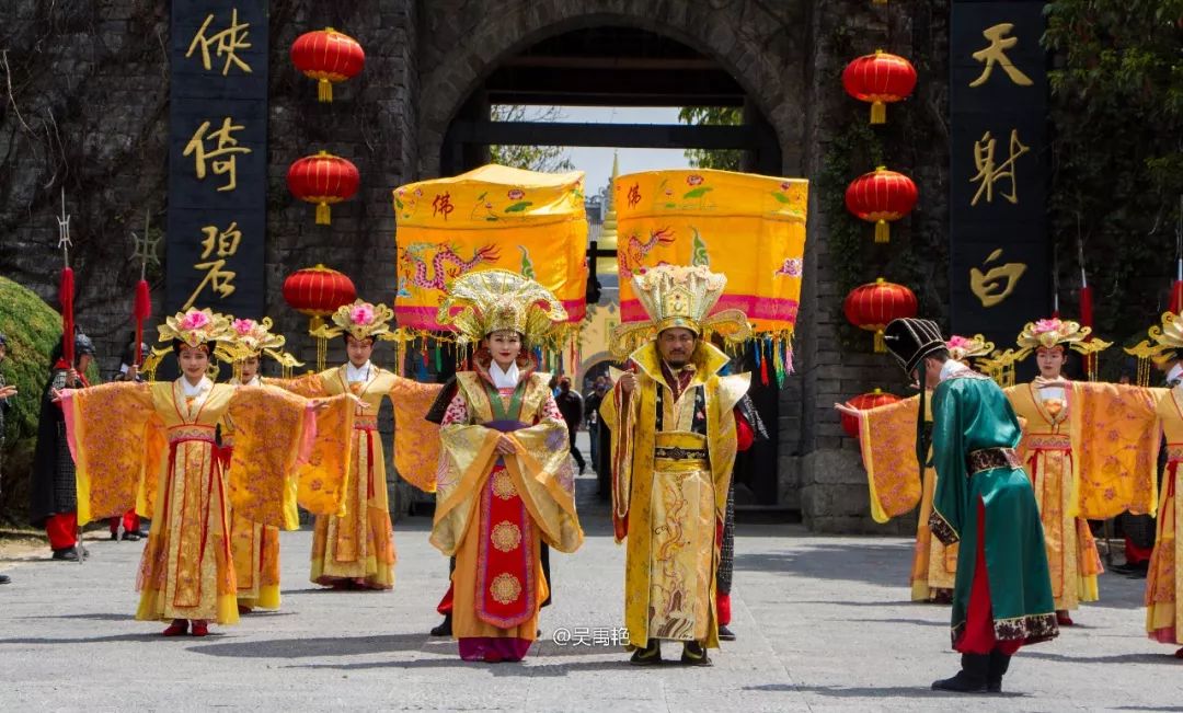 伴隨著磅礴大氣的音樂,天龍八部影視城城門開了,身穿古裝的士兵、大理國國王、皇后先后來到門口迎接四方游客!