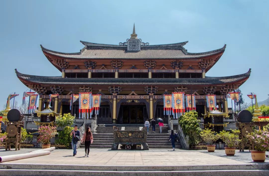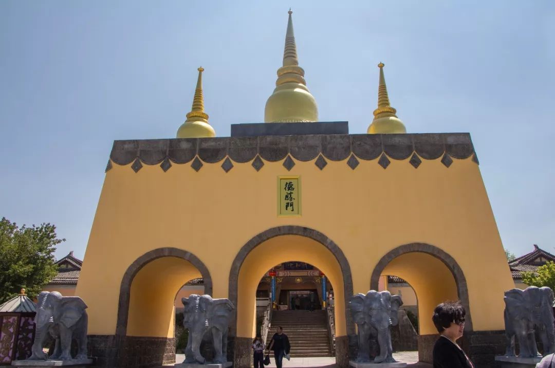 門前的四頭大象有很深的寓意,在北宋時期,大理國是一個崇尚佛教文化的國家,“象”與“祥"諧音,有吉祥的意思,而大象的腳,有四平八穩(wěn)的意思,寓意著大理國的江山永駐,在大門的頂上有三座金塔,這也印證了大理是一個崇尚佛教文化的國家。