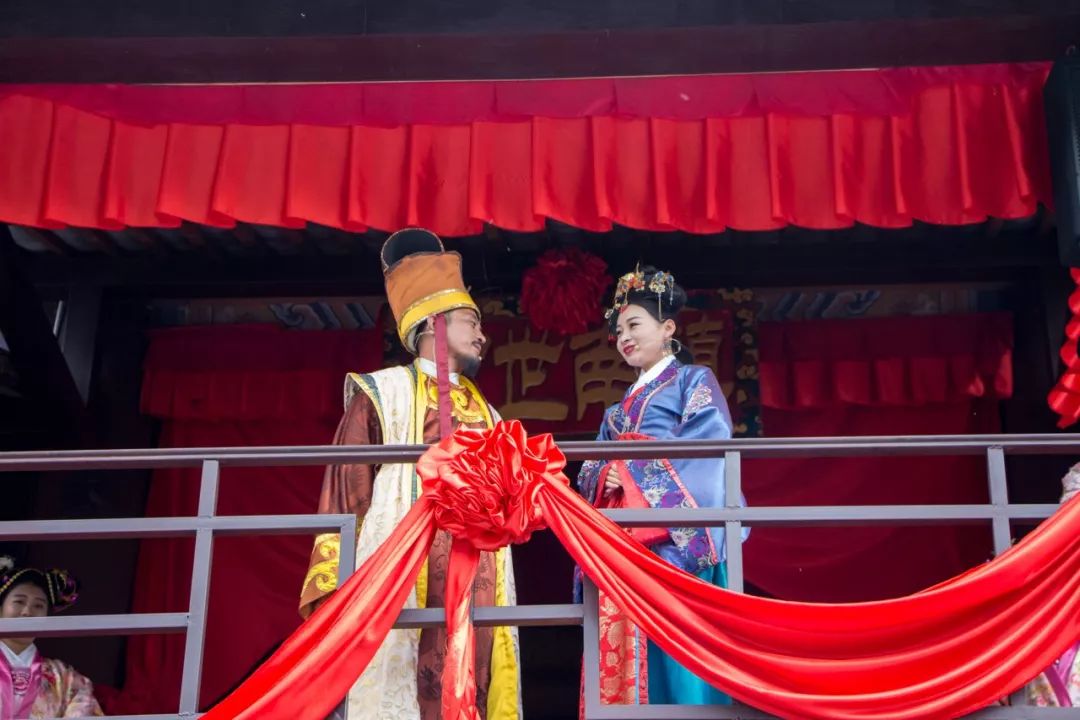 隨著段家老爺接圣旨,段家小姐在鑼鼓聲、歡呼聲中上繡樓選良婿,這里的表演正式開始了!