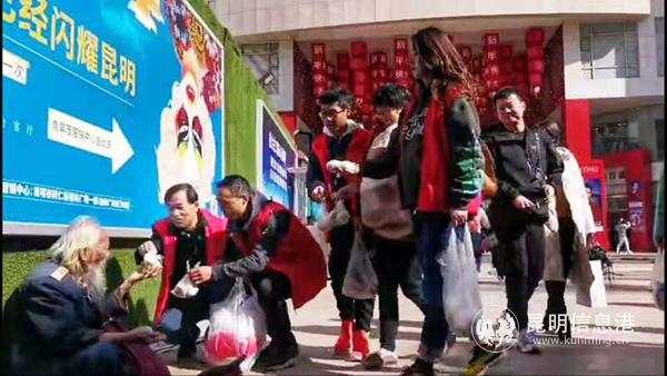 昆明信息港訊 1月12日下午,昆明之美在市中心的南屏步行街地區(qū)開(kāi)展新時(shí)代文明實(shí)踐志愿服務(wù)活動(dòng),志愿者顧中國(guó)、艾慶瑋、艾宣睿、潘麗、董海燕走上街頭為流浪者送食品,送上昆明這座城市對(duì)流浪在昆明兄弟姐妹的溫暖。