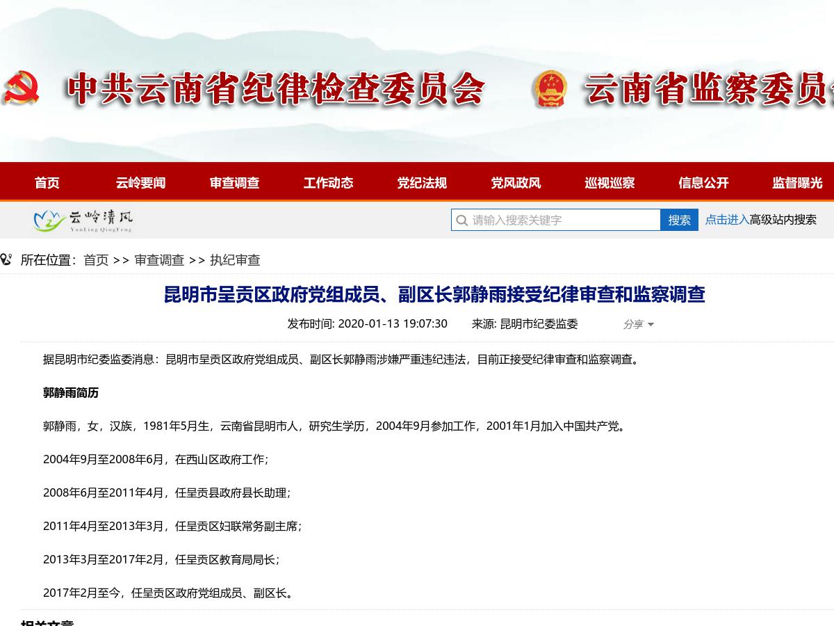 據(jù)昆明市紀(jì)委監(jiān)委消息:昆明市呈貢區(qū)政府黨組成員、副區(qū)長(zhǎng)郭靜雨涉嫌嚴(yán)重違紀(jì)違法,目前正接受紀(jì)律審查和監(jiān)察調(diào)查。
