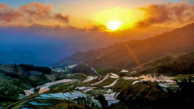 當(dāng)?shù)谝荒?yáng)光從天邊噴薄而出的時(shí)候,一副熠熠生輝的畫卷便在人們面前展開(kāi),當(dāng)最后一道光線消失在地平線后,整個(gè)大地籠罩在落日的余暉中,輝煌燦爛。世間最難 得的是時(shí)間,最美麗的是時(shí)間的開(kāi)始和盡頭——日出和日落。今天,大家有眼福啦,我讓大伙一起看看玉溪元江那諾梯田的“醉人”日出。