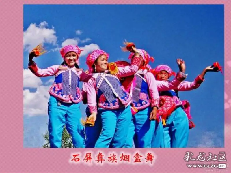 煙盒舞又叫跳弦、壟X,是云南彝族支系尼蘇潑的一種群體性民間舞蹈,由于舞者使用的伴舞、發(fā)出樂聲的工具類似于煙盒而得名。煙盒工具外表像當?shù)匾郧八玫氖⒎挪轃?、“旱煙”的盒子,在外殼沿邊粘結(jié)上細長的線做裝飾而成。舞者跳舞時需根據(jù)音樂節(jié)拍規(guī)律的彈奏手里的煙盒,從而形成合奏以豐富表演。彈奏煙盒需要一定的技巧和學(xué)習(xí)基礎(chǔ),舞者拿煙盒時需要中指扣緊煙盒蓋,食指和大拇指在盒內(nèi)彈奏。由于它的獨特性,在2006年,彝族煙盒舞被列入國家第一批非物質(zhì)文化遺產(chǎn)名錄。