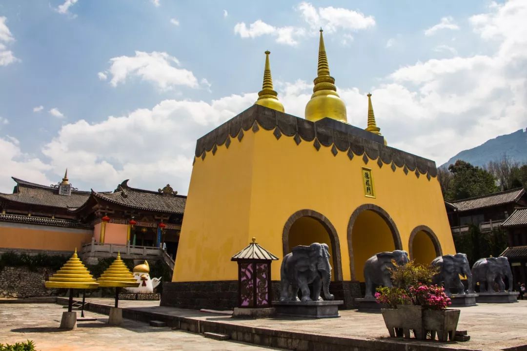 走到大理街的盡頭,那座金光閃閃的建筑便是大理皇宮的正大門,大理受佛教文化影響,所以大理皇宮的建筑帶有佛教文化的印記,如大理皇宮的正大門——德勝門,門口兩邊的四頭大象和頂上的三座金塔的由來都和佛教文化息息相關(guān)。