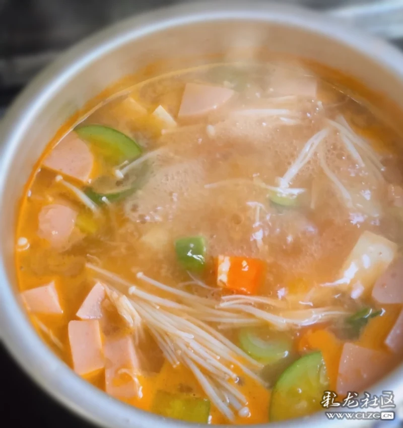 3、淘米水燒開(kāi)、放入辣椒醬,然后將食材依次放入湯中,加一點(diǎn)鹽,煮熟就可以使用啦