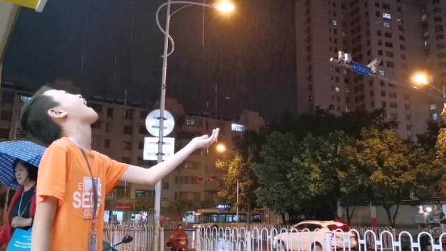 這個英俊少年陶醉在昆明今晚的秋雨中