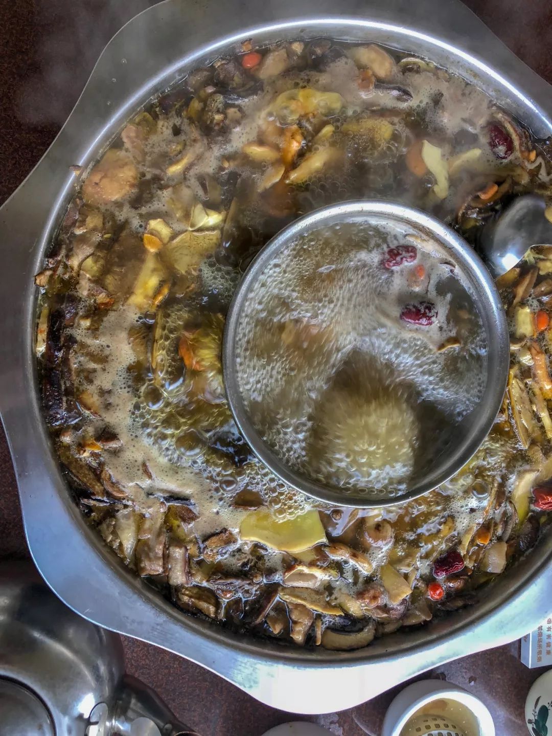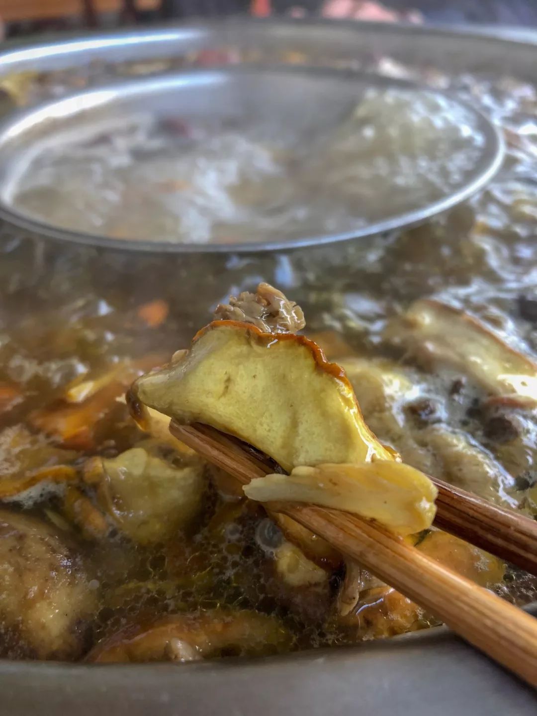 經(jīng)過(guò)高溫煮沸之后,野生菌的香氣從翻滾的湯中彌漫到空氣中,讓人忍不住狂咽口水,煮了40分鐘之后,火鍋終于可以吃了。