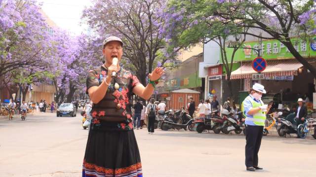 藍花楹街的網(wǎng)紅彝族歌手現(xiàn)場錄制演唱納西族的歌曲