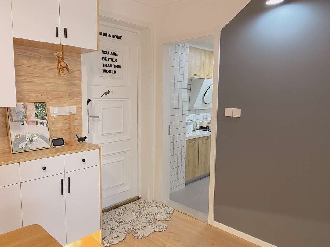 進(jìn)門左邊是廚房,右邊是餐廳。原來(lái)入戶門是豬肝紅后來(lái)業(yè)主自己動(dòng)手改造成白色的了。
