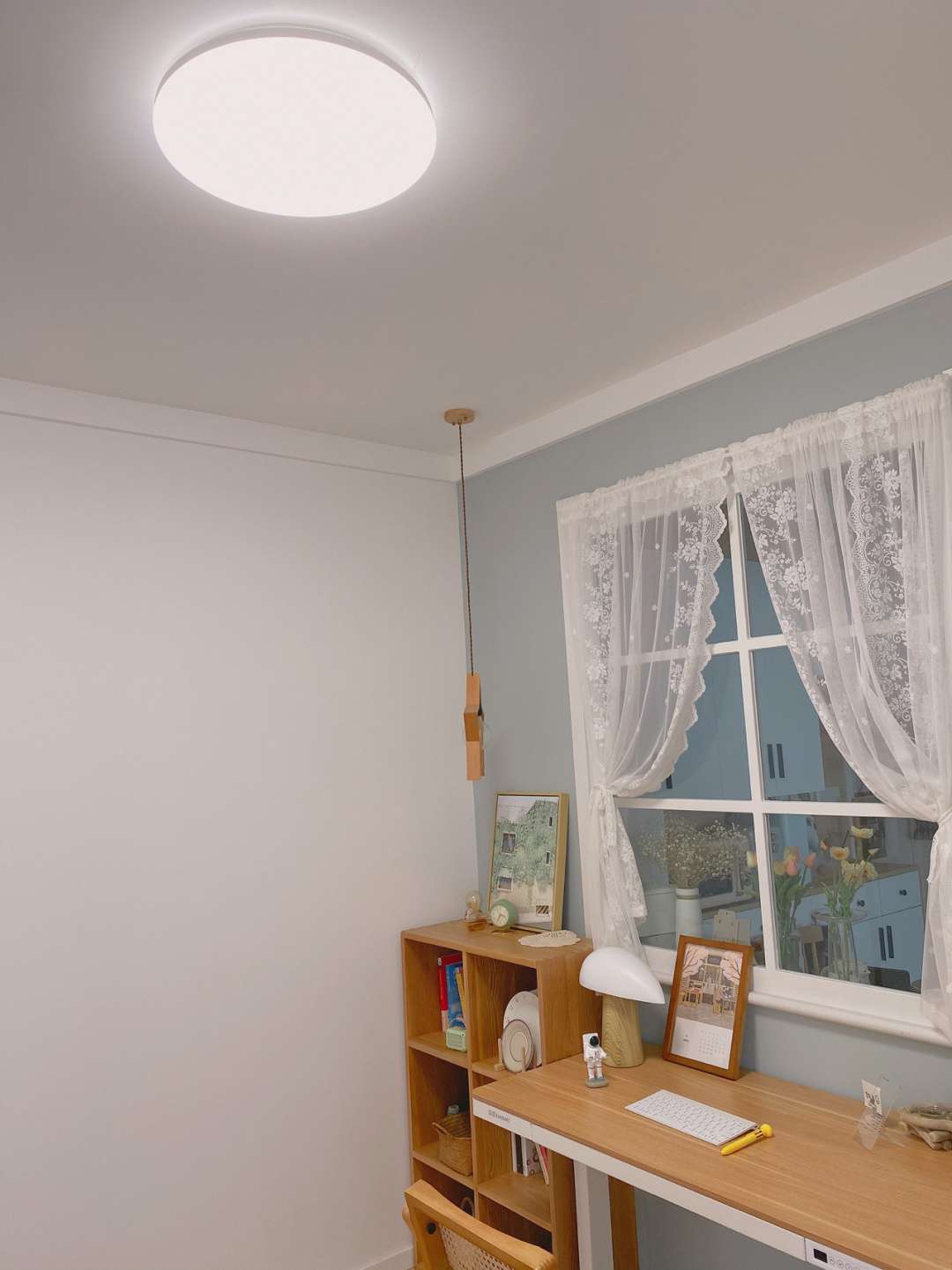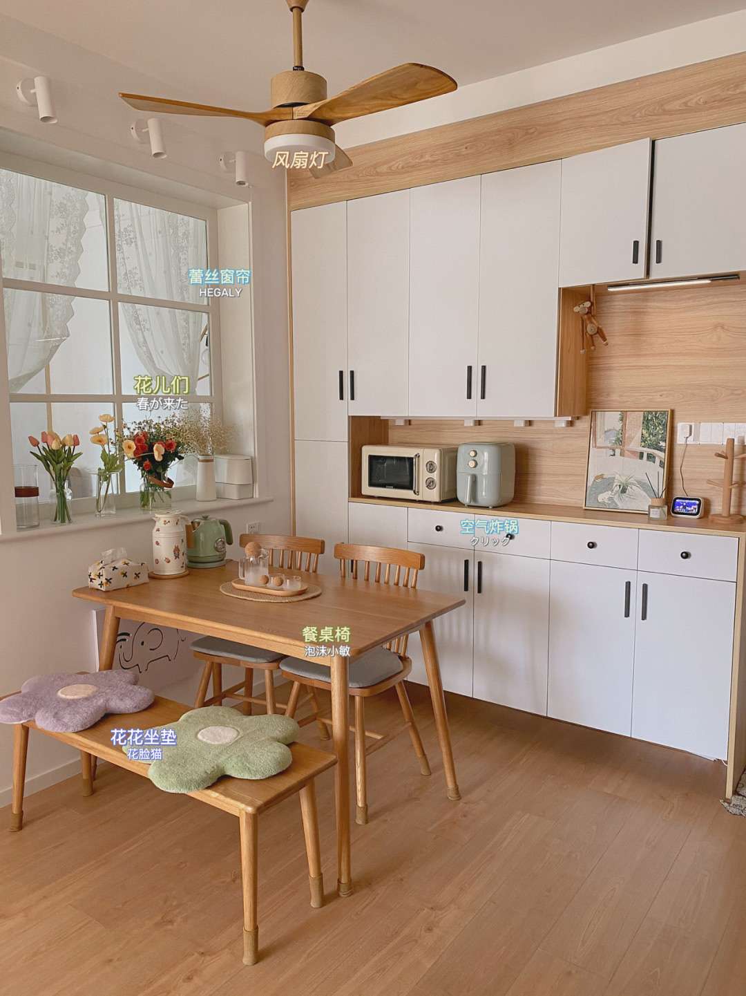 餐桌上方裝了一個(gè)風(fēng)扇燈,很好用,窗戶上方安裝了三個(gè)射燈,主要是制造氣氛。