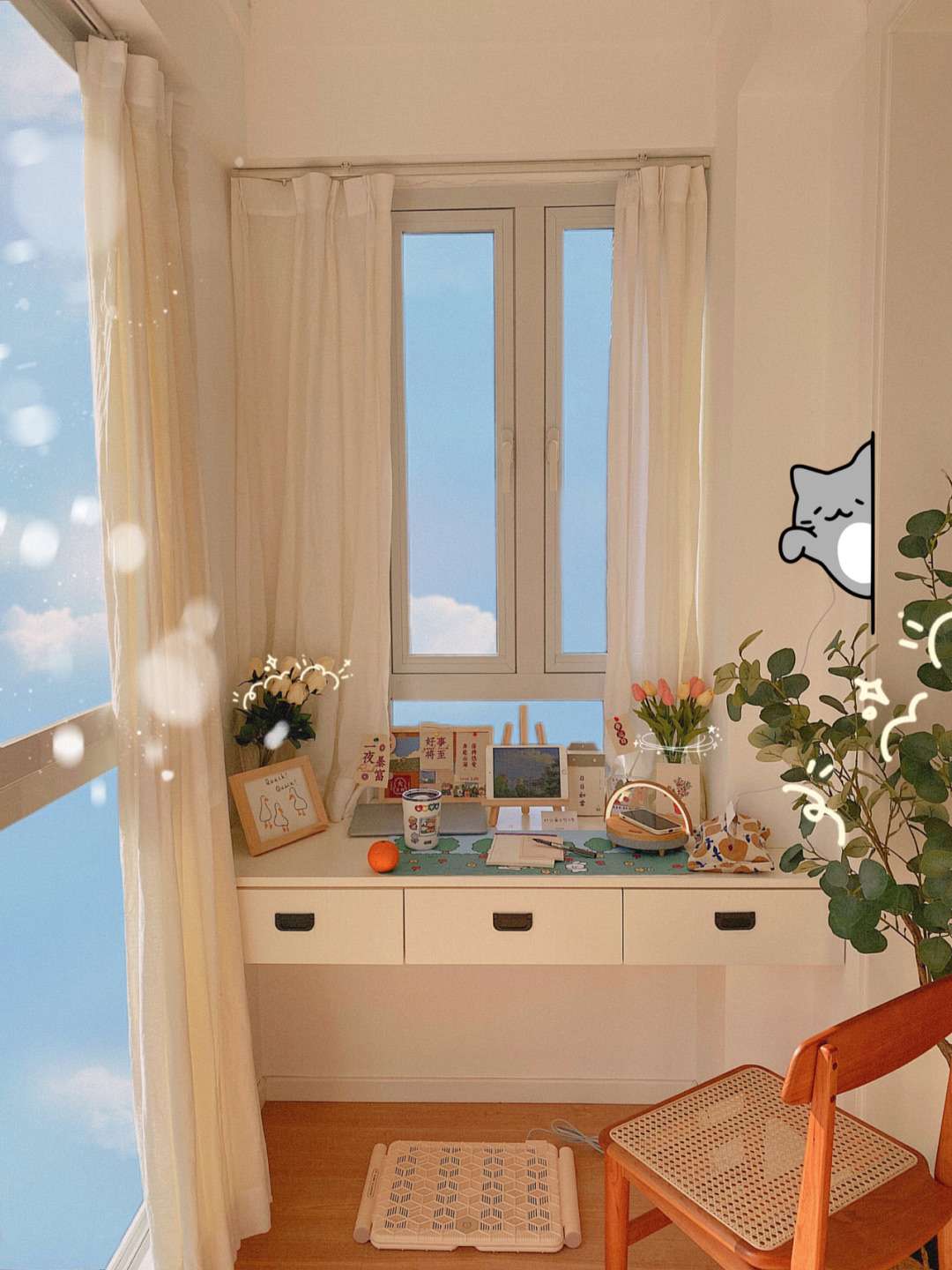 裝修的時(shí)候業(yè)主就要做一個(gè)休閑陽(yáng)臺(tái),也是給自己留出了一塊屬于自己的休閑角落。木工師傅制作了這么一個(gè)書桌,正面和側(cè)面都是落地窗戶,這里視野很開闊,光線很好~