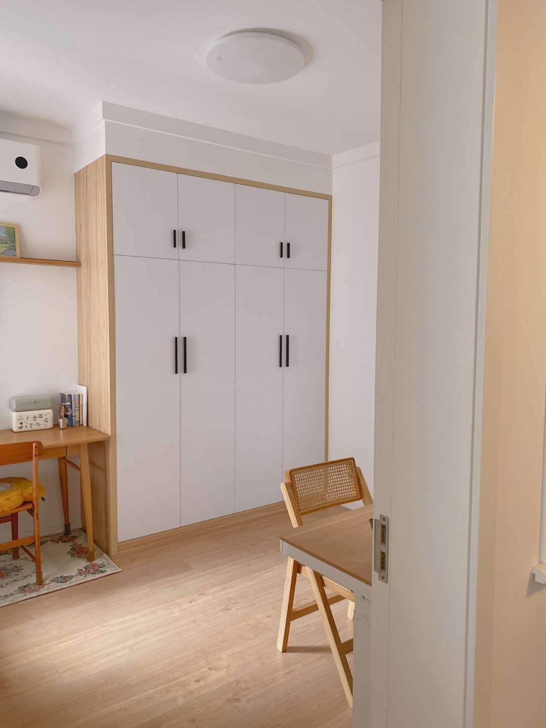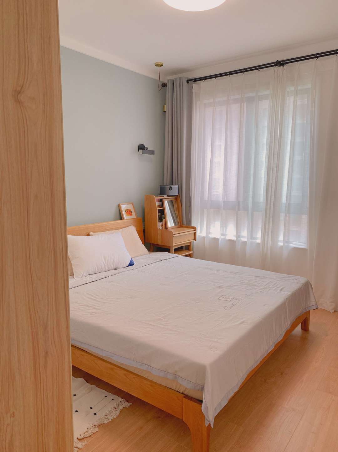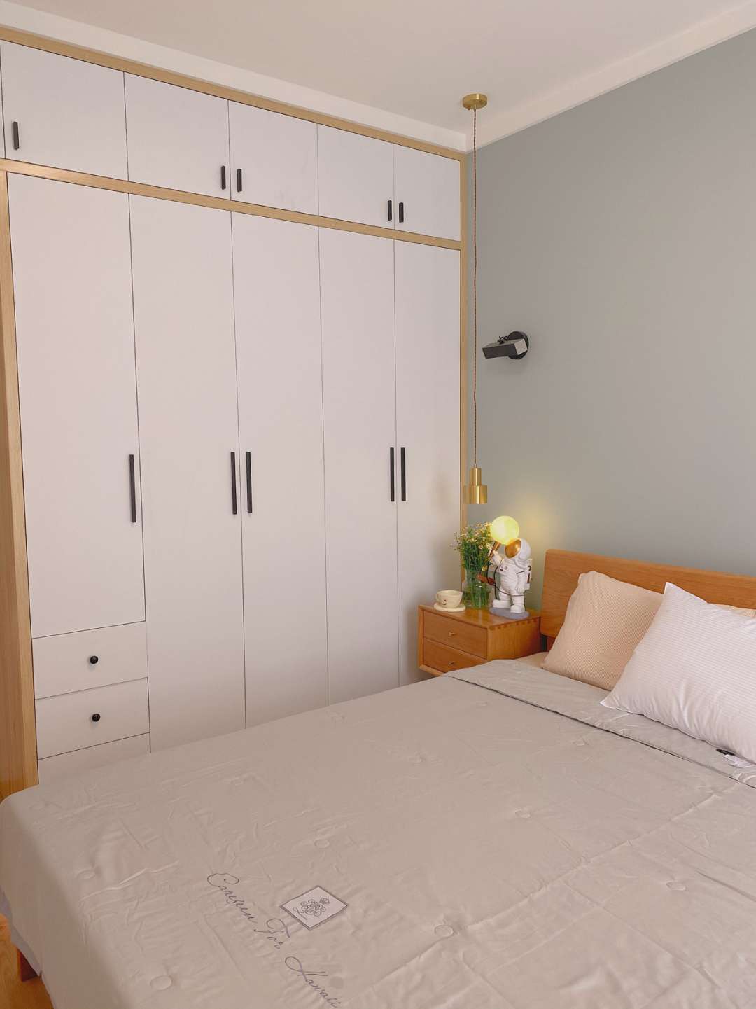 主臥考慮到睡眠淺,窗簾也跟其他空間不同,選擇了灰色遮光簾,拉上完全不透光,周末可以肆無(wú)忌憚睡懶覺。整體空間也比較以實(shí)用為主,所以打了很大的衣柜沒有浪費(fèi)任何儲(chǔ)物空間。