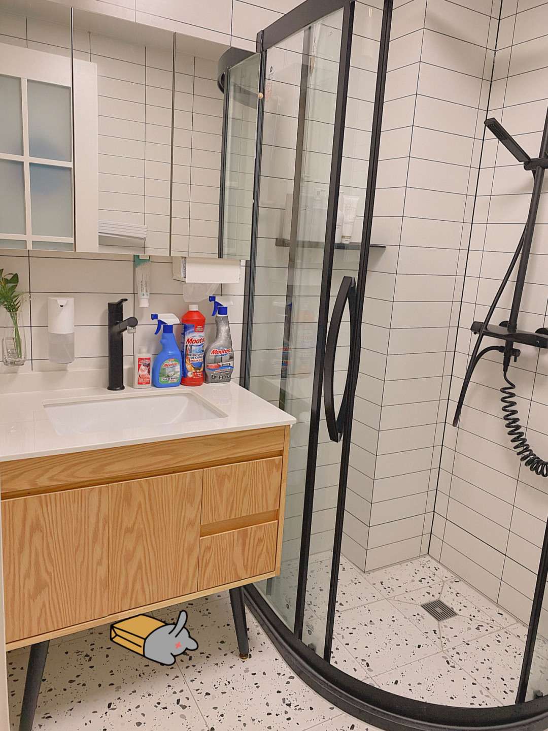 冰箱的側(cè)面也是一個(gè)很好的收納空間,很多常用的東西像廚房清潔劑和擦手巾以及磁吸式的廚房剪什么的都可以放~?衛(wèi)生間雖然也是只有3平多點(diǎn),還是做了干濕分離。