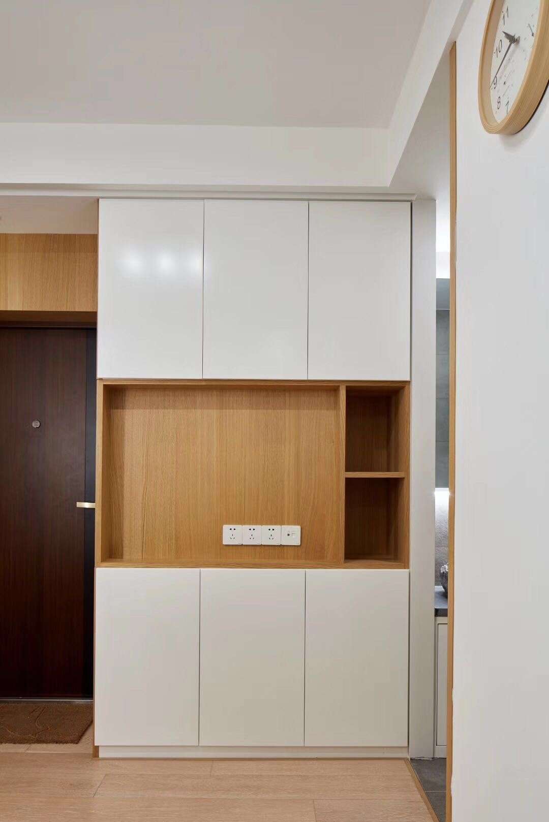 進(jìn)門入戶鞋柜是到頂中空式的,用的免漆板+平板柜門,中間還特地留了插座,方便使用各種小電器或者手機(jī)充電。