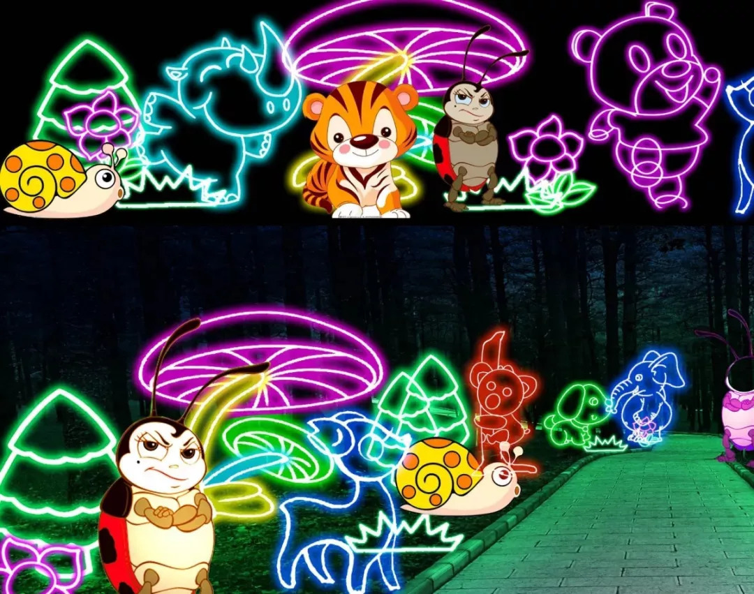 各種呆萌的動物光雕裝飾置展于道路兩旁,讓小朋友們流連忘返!