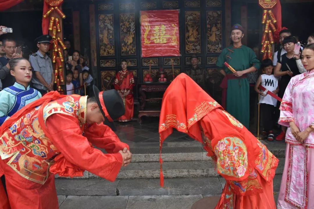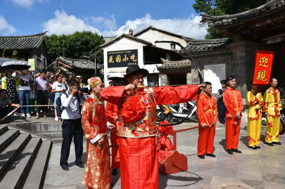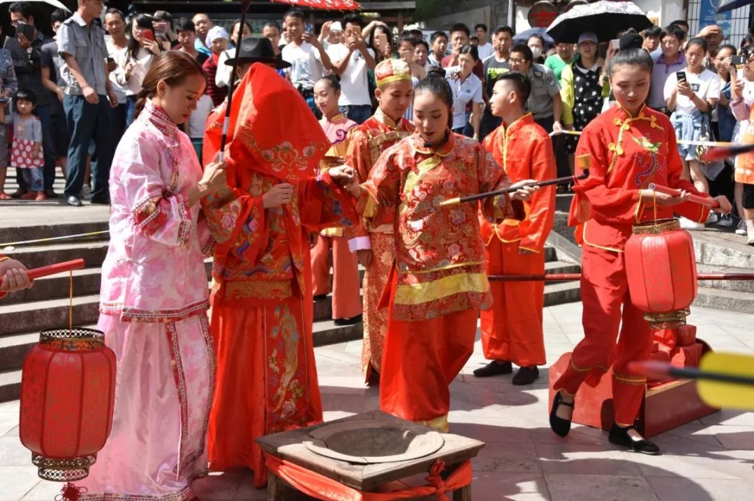 由于建水受到濃厚的封建禮教影響,婚禮有很多復(fù)雜的環(huán)節(jié),這個婚禮分為求婚、訂婚、結(jié)婚、回門等幾個方面,而古婚禮實景小劇場以朱家公子結(jié)婚為題材,真實還原了建水當(dāng)?shù)氐慕Y(jié)婚儀式,整個結(jié)婚儀式要經(jīng)過跨鞍馬、跨火盆、射箭、拜堂、看戲等環(huán)節(jié)。