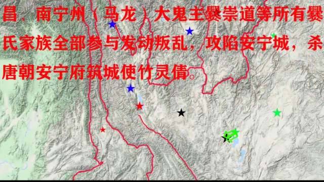 何履光大軍走后,以昆州刺史(今昆明)爨日進、南寧州(今曲靖市)刺史爨歸王和爨氏大姓爨崇道為首,梨州(今華寧縣)刺史爨棋、求州(今武定縣)刺史爨守弟、螺山(昆明圓通山)大鬼主(大祭司)爨彥昌、南寧州(今曲靖馬龍縣)大鬼主爨崇道等所有爨氏家族全部參與發(fā)動叛亂,攻陷安寧城,殺唐朝安寧府筑城使竹靈倩。
