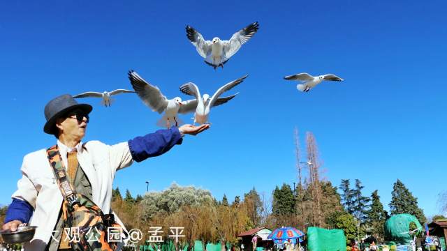 看著喂鷗人發(fā)自內(nèi)心的高興情緒,聽著如音樂般的鷗鳴聲聲,它們?cè)谖倚睦飿?gòu)成了一組“人鷗和諧”的交響曲,那是昆明這座全國(guó)文明城市與鷗結(jié)緣三十多年譜寫的心曲!隨著喂鷗人的場(chǎng)地轉(zhuǎn)移,海鷗在他們身后追逐飛翔,并不時(shí)鳴唱美妙的歌聲,用海鷗的語(yǔ)言,講述它們?cè)诶ッ鞫彀l(fā)生的故事,訴說它們對(duì)昆明市民的感謝真情!