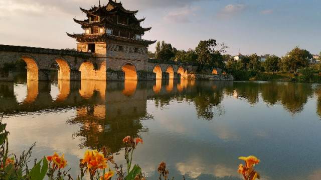 2022年9月23日,晚霞映紅建水縣應天湖中的十七孔橋。