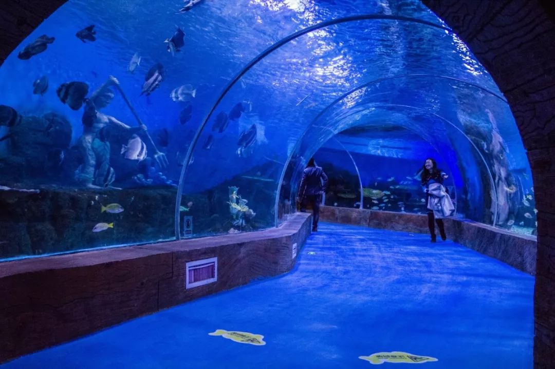 站在透明,幽深的海底隧道下