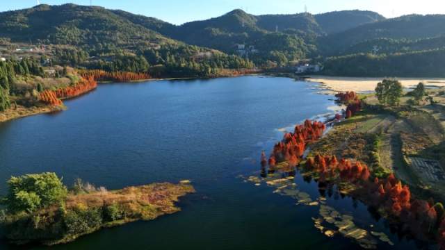 初冬的三家村水庫美如仙境,一棵棵姿態(tài)萬千的紅杉,淺紅、深紅,顏色交織在一起,艷麗而炙熱。浮萍嫩黃,湖水湛藍(lán),色彩繽紛……
