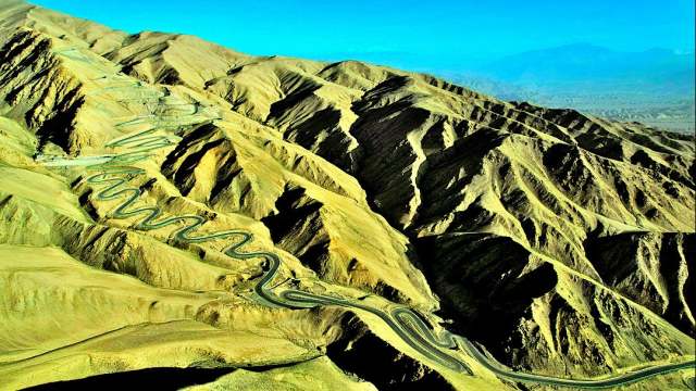 打卡新疆帕米爾高原上的網(wǎng)紅公路,蟠龍古道。航拍下,黑色的柏油路面猶如一條東方的巨龍,騰躍帕米爾的山巔之上。黑色的柏油路和淺黃色的山體形成鮮明對(duì),明暗相間,視覺非常震撼。蟠龍古道,驚險(xiǎn)刺激,風(fēng)景極佳。蟠龍古道正式名字叫吾格亞提盤山公路,它是新疆喀什地區(qū)塔什庫爾干塔吉克自治縣城到瓦恰鄉(xiāng)之前的公路,全長36公里,有608個(gè)發(fā)卡彎道,180度的大彎全部集中在最后一段山脊上,險(xiǎn)峻路段,讓自駕愛好者們都深深嘆服。