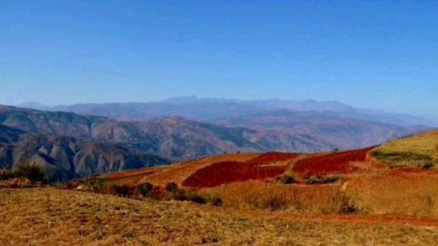 大風(fēng)吹過紅土地上的村莊。(昆明尋甸金源龍?zhí)洞?