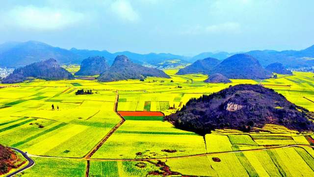 從空中俯看,晨霧中的金雞峰叢,峰林深處騰起縷縷云霧,渺渺升空,遠(yuǎn)山且隱且現(xiàn),猶如騰云駕霧,繚繞的云霧給峰林菜花抹上了一層靜謐的美。神奇而美麗的羅平金雞峰叢,挺拔秀麗,蔚為壯觀。尤其在金色的油菜花映襯下,恰似一幅壯美的畫卷。