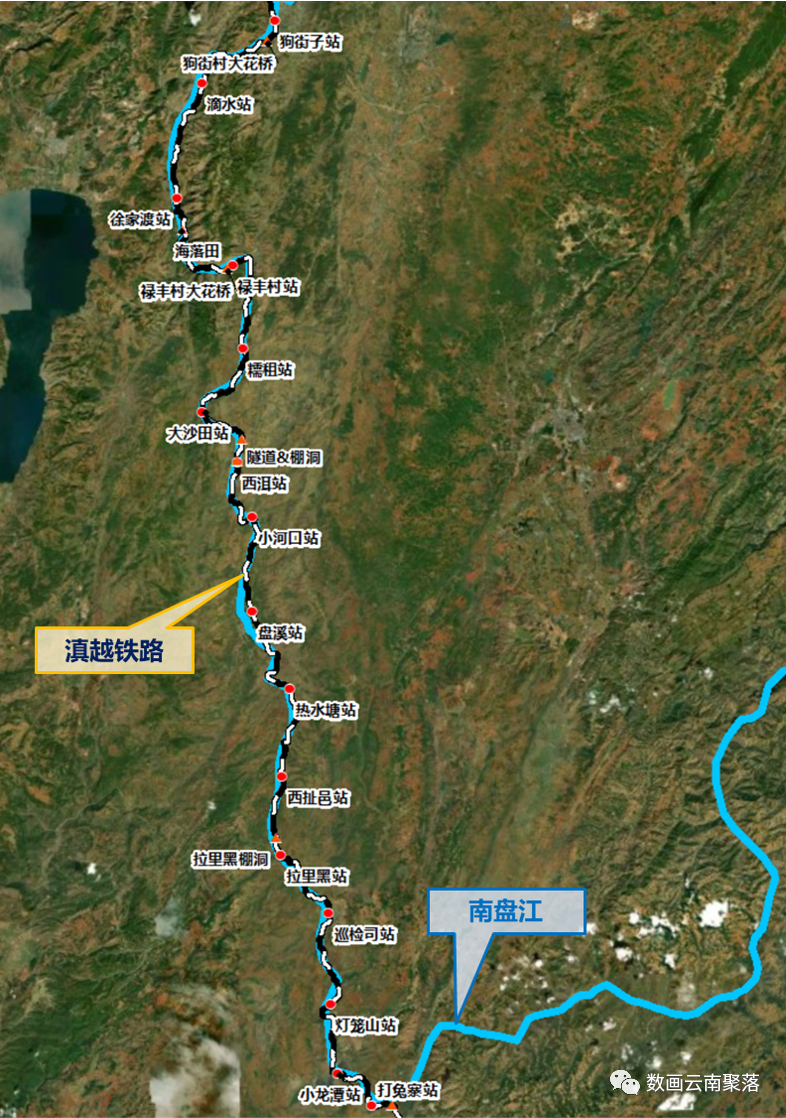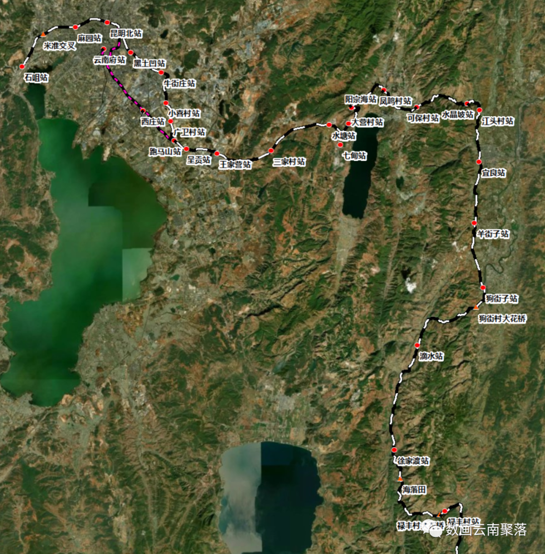 從以上描述的線路變遷歷史來(lái)看,想在昆明主城內(nèi)尋覓最初的滇越鐵路印記,已然如水中撈月了。要在距離省會(huì)昆明最近,又能真實(shí)品味滇越鐵路相對(duì)完整的原貌,體驗(yàn)當(dāng)年的法式風(fēng)情,則非宜良莫屬了。自呈貢站往河口方向延伸的滇越鐵路,再途經(jīng)王家營(yíng)站、三家村站、水塘站后,她將正式進(jìn)入宜良。這將帶來(lái)一段曼妙的旅途:它從滇越鐵路線路海拔最高的山巔,經(jīng)過(guò)山澗平地、越過(guò)礦洞工區(qū)、乘著峽谷巖壁,最終落入富饒的宜良魚(yú)米壩區(qū),而后它與南盤(pán)江一起,在宜良?jí)巫拥囊粬|一西兩側(cè)南北貫穿而行,并在壩子南部的高古馬村附近,兩線交匯,隨后并駕齊驅(qū)150公里后,才在紅河開(kāi)遠(yuǎn)的打兔寨處,分離。