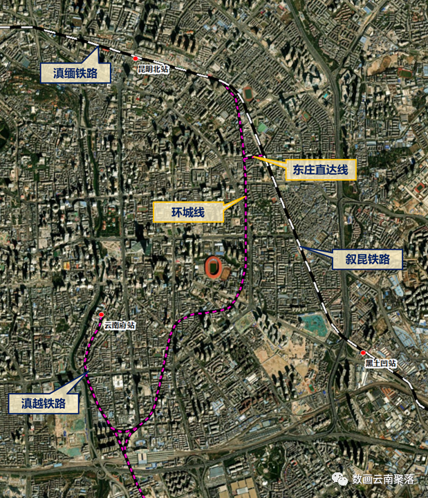 盡管由于權(quán)屬問(wèn)題,導(dǎo)致“總站”與“府站”在昆明小城的南北分離,但三條米軌線路的連通還是十分必要的。于是,1938年(民國(guó)27年)敘昆鐵路工程局在府站和總站間修建了約4.9公里的環(huán)城線連接兩站,后又于1945年(民國(guó)34年)由川滇鐵路公司在敘昆線上出岔,修建482米的東莊直達(dá)線與環(huán)城線相連,以緩解三條線路抗戰(zhàn)時(shí)期的交通聯(lián)系不便問(wèn)題。