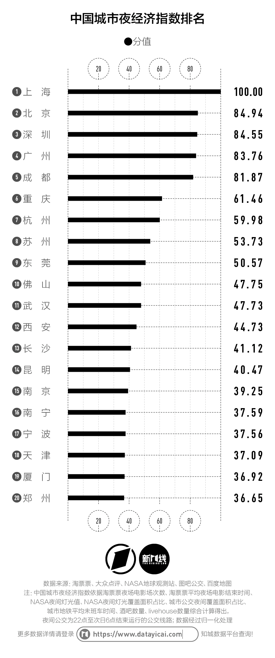 2017年起,第一財(cái)經(jīng)·新一線城市研究所持續(xù)發(fā)布“知城·夜生活指數(shù)”,以觀測(cè)不同城市在夜間的活躍程度,以及這座城市是否能給人們提供夜生活便利的條件,也為夜間業(yè)態(tài)的商業(yè)決策以及相關(guān)城市研究提供支持。