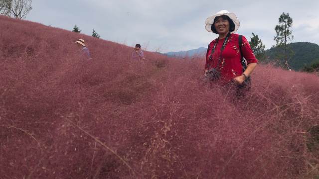 秋日賞粉黛亂子草花海 金風掃葉飄,粉黛賽花妖。 翠嶺浮仙霧,寒秋暮氣消。