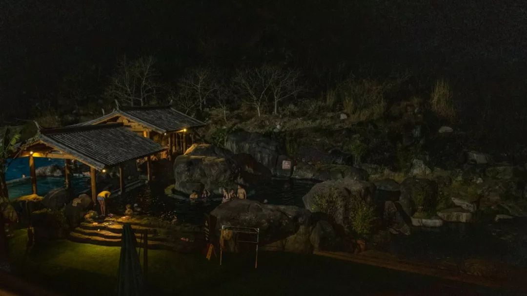 夜幕落下帷幕,山風(fēng)輕拂,分布在山間的“湯”池,開始逐漸展露它的容顏,光暈折射在溫泉表面,溫泉中的人正在享受這山間夜晚風(fēng)光和溫泉帶給他們的舒適。