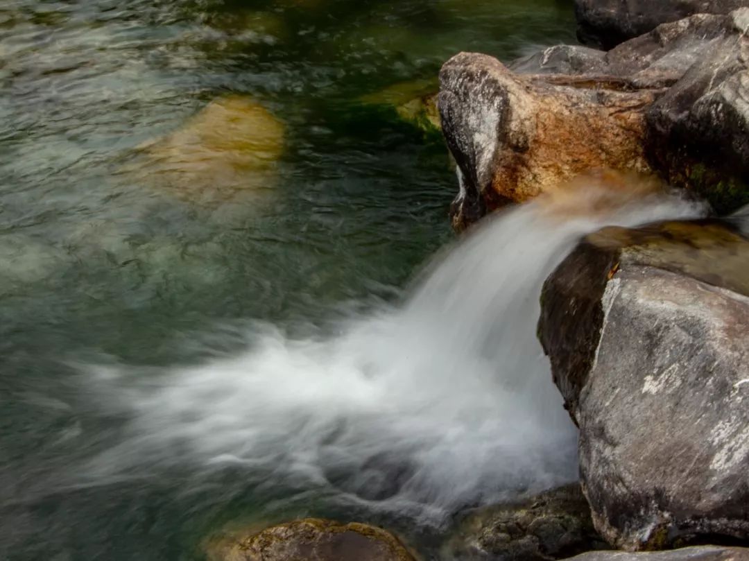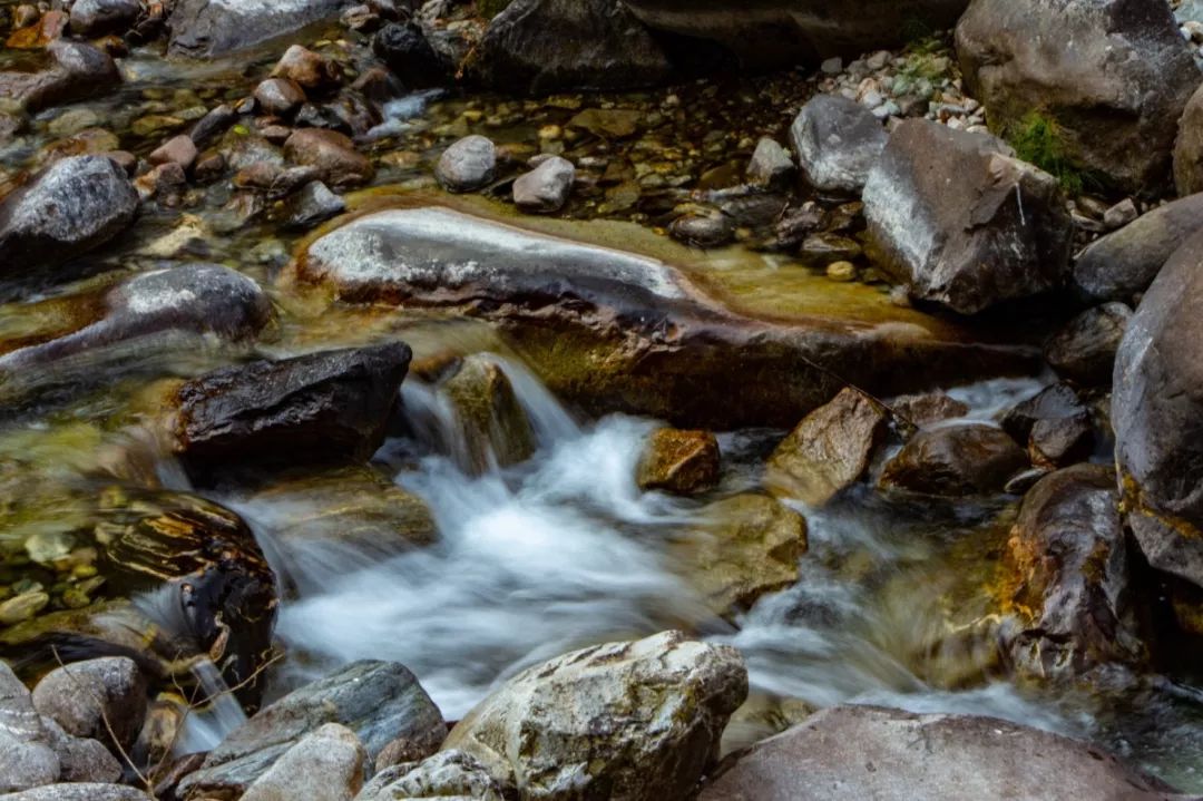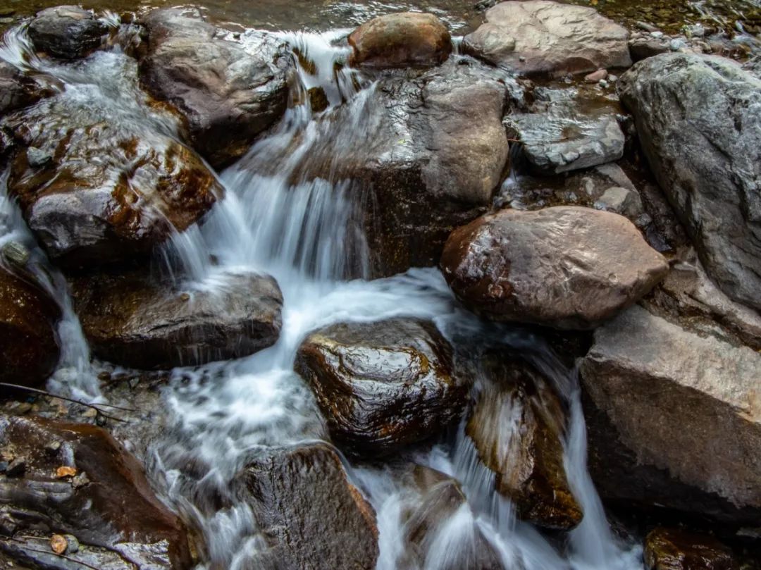 來到谷底,瀑布形成的水流變成一條條小溪,在山間穿行,一塊巖石,一個(gè)坑洼都能改變它前進(jìn)的方向,但是卻改變不了它的目的地。