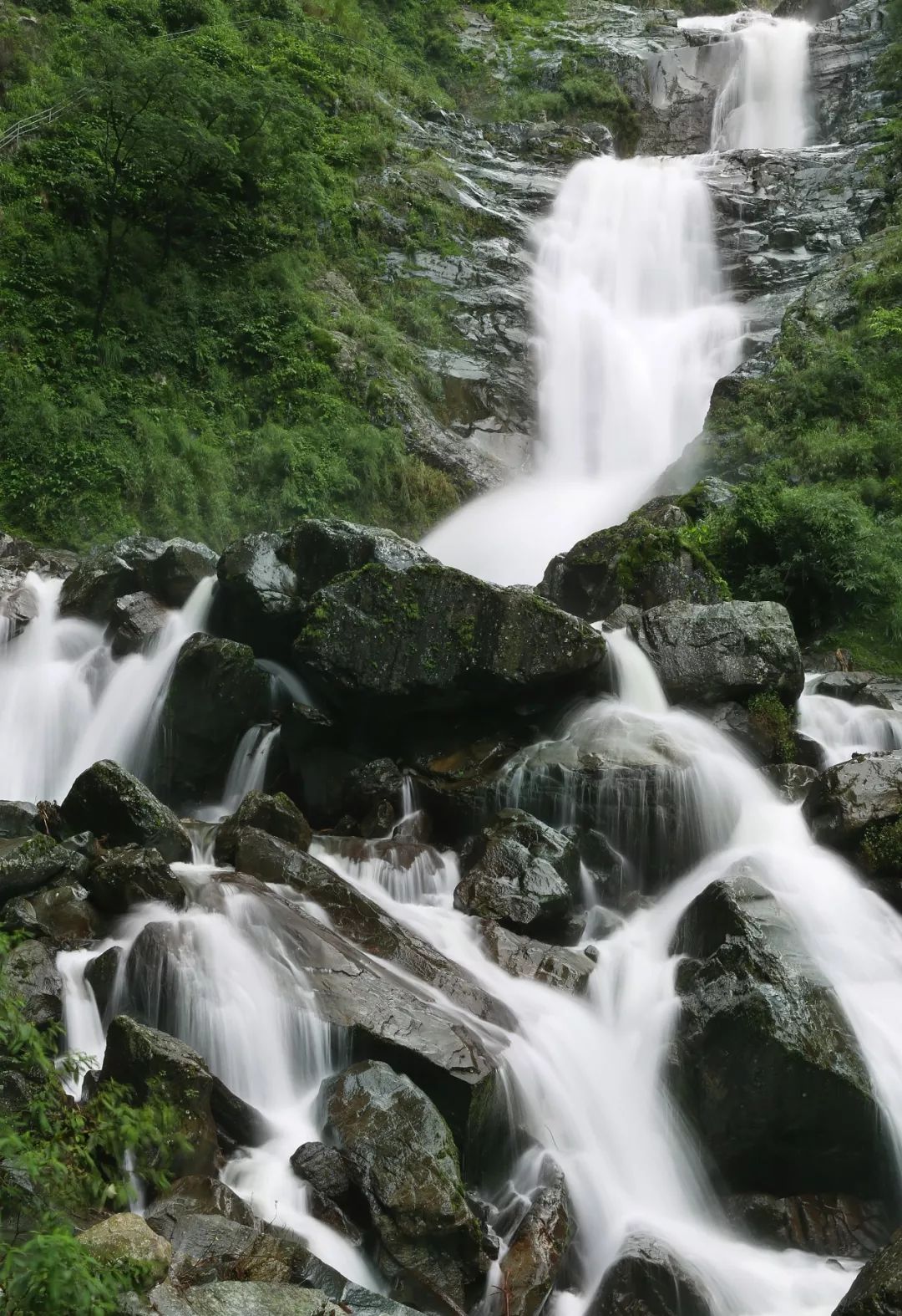 靠近瀑布,最先進(jìn)入眼簾的是那耀眼的純白,如同從天而降,把天上的白云一同帶到瀑布中,白云和瀑布纏繞在一起無論用任何力量再也無法分開,“飛流直下三千尺,疑是銀河落九天”景象大抵也就是這樣。
