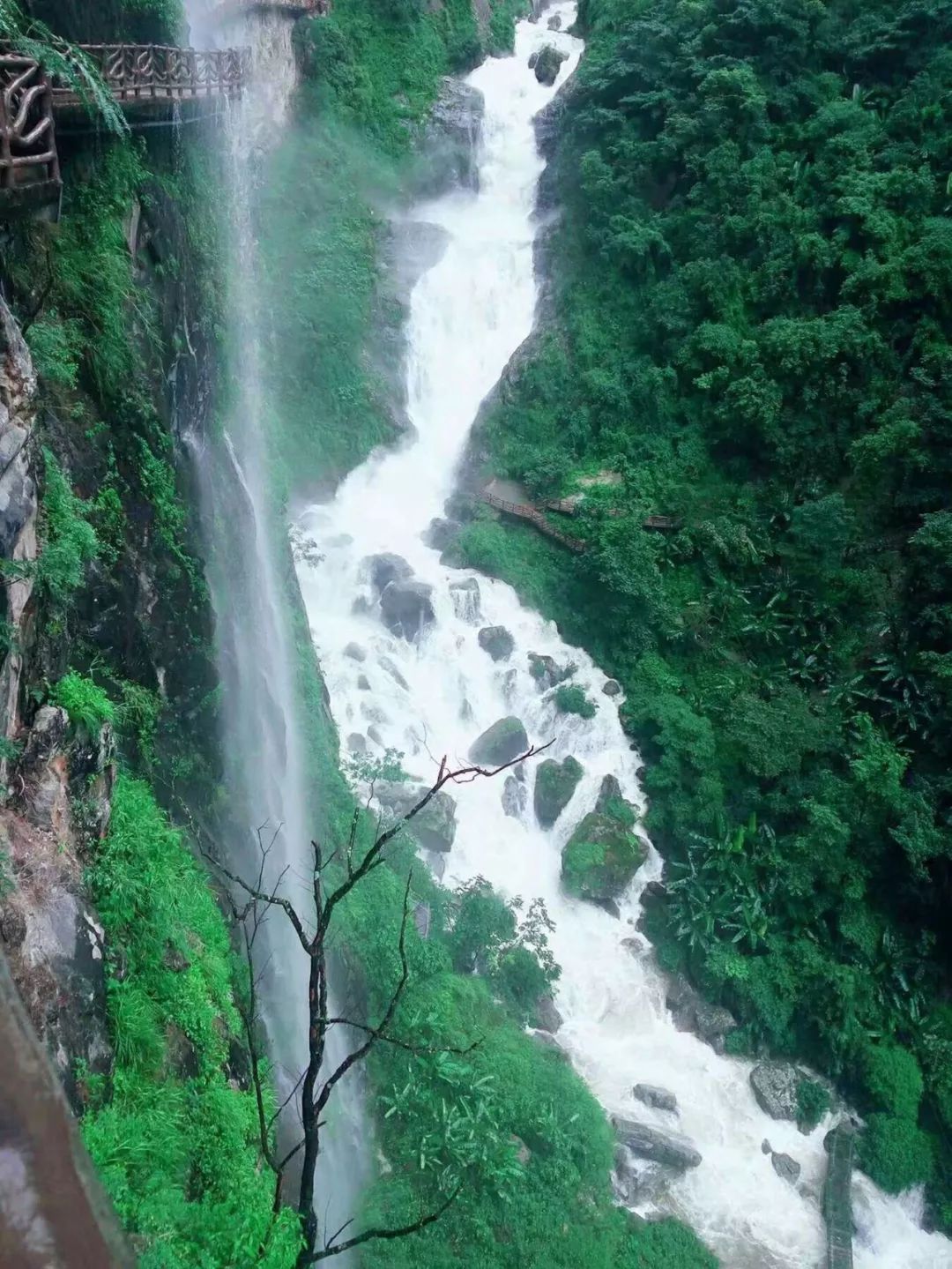 走在玻璃棧道上,能飽覽峽谷風(fēng)光,從玻璃棧道出來,沿著懸崖上的棧道繼續(xù)向上攀登,巨大的水聲不斷從遠(yuǎn)處傳來,就快見到傳說中的瀑布景色了。
