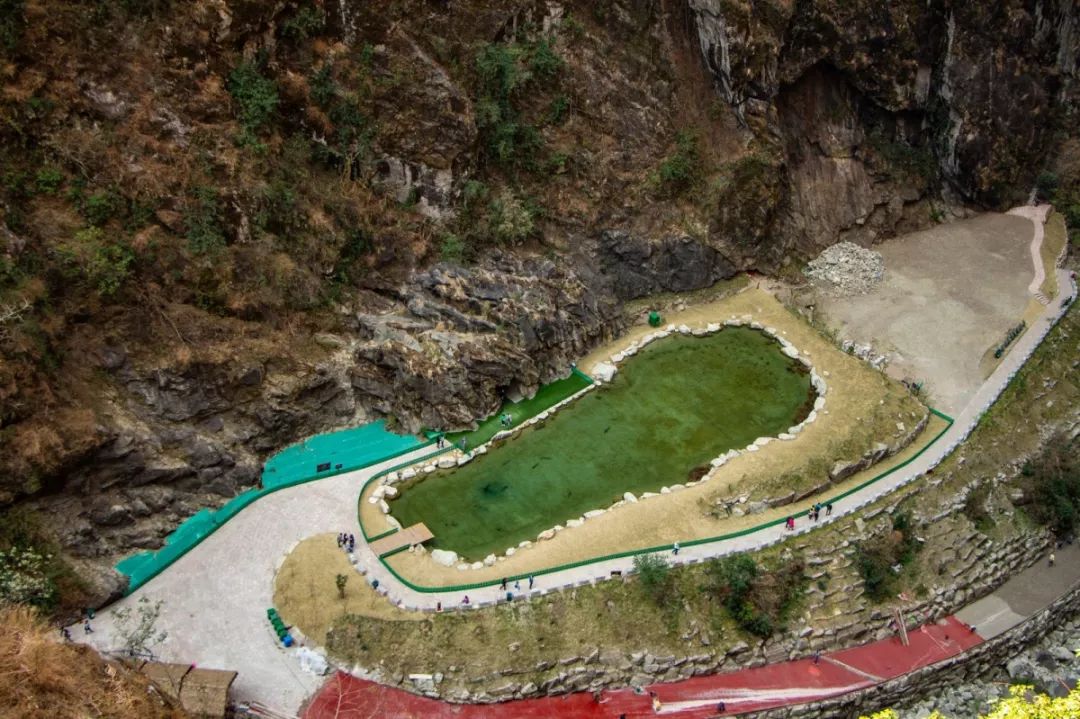 在峽谷中,有三個(gè)必看的景點(diǎn),全國(guó)唯一一個(gè)上熱搜的溶洞廁所;日月湖;高空玻璃棧道和七彩水簾。