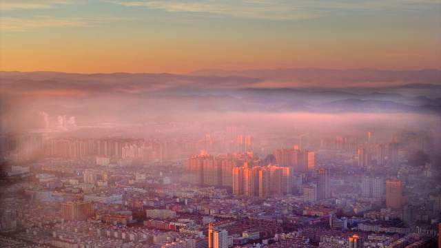 薄霧籠罩下的城市,朦朧中的海市蜃樓