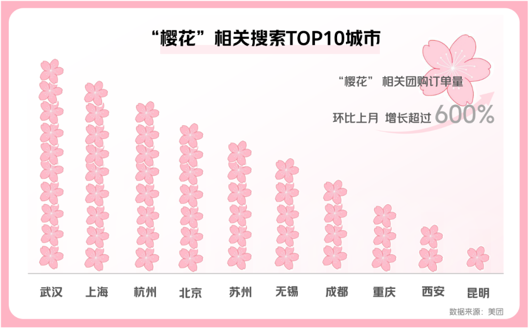 三四月,是踏青賞花的好時(shí)節(jié)。而櫻花,更是眾多游客的心頭好。3月25日,根據(jù)美團(tuán)、大眾點(diǎn)評(píng)數(shù)據(jù)顯示,截至3月21日,櫻花相關(guān)搜索量環(huán)比增長(zhǎng)146%,TOP10搜索城市分別是:武漢、上海、杭州、北京、蘇州、無錫、成都、重慶、西安、昆明。