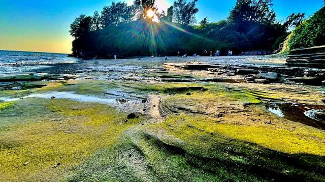海灘上的青苔拍出來很美,是觀日出的好地方,每天清晨,太陽從海平線上徐徐升起,美極了。