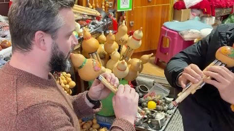 我的英國(guó)學(xué)生在昆明南屏步行街學(xué)吹葫蘆絲。(拍于2024年2月)