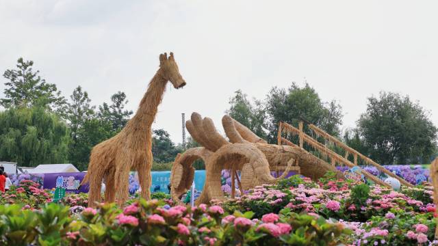 昆明滇池國家旅游度假區(qū),海埂公園陽光大草坪的繡球花“奔來花展”,占地四千平米,茂密的枝葉簇擁著沉甸甸的花團,繡球花已然進入盛放的季節(jié)。在絢麗多姿的花園中,每隔幾步就能看見巨大的“稻草”雕塑,憨態(tài)可掬的小貓咪,張開雙臂擁抱著一簇鮮花的稻草人。