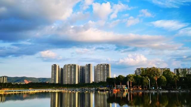 從此廣場往南方向看去,南側(cè)建筑物水中倒影非常漂亮,這個角度拍攝彝海風(fēng)景,還是比較精彩的。